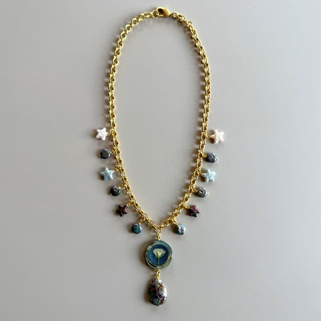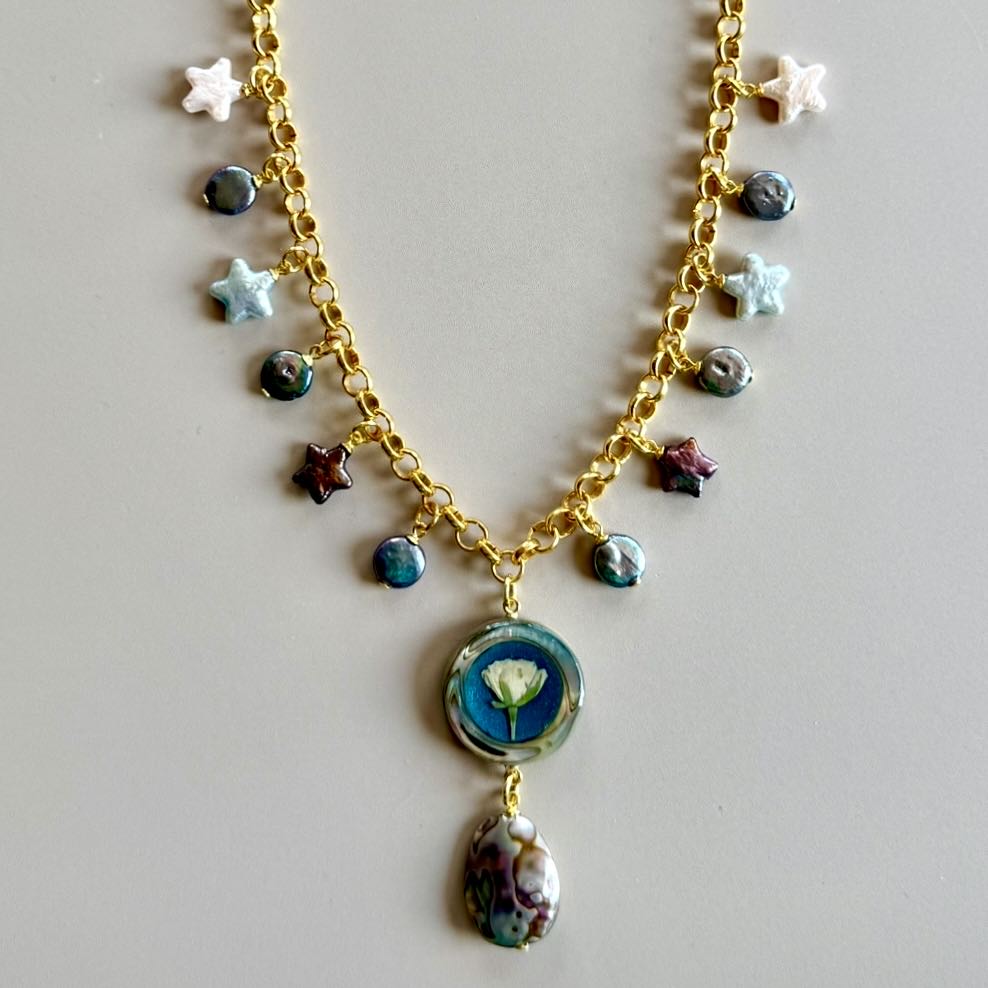 The Andromeda necklace features a galaxy of freshwater pearl stars and moons in gold vermeil settings and a petite white rose preserved in resin and abalone frame with hand painted background and an abalone focal pendant. Gold vermeil chain with lobster clasp.