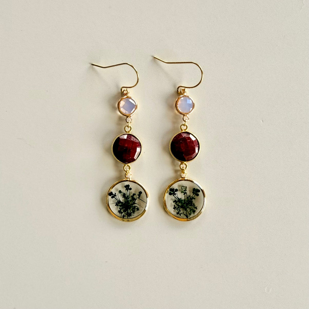 Faceted crystals and rubies with black Queen Anne’s Lace in gold filled frames ~ with gold fill ear wires. All bezels are gold fill.