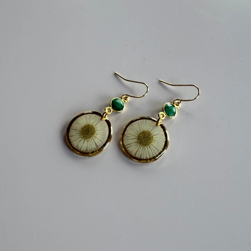 Real Daisies preserved in resin in gold fill frames with Emeralds in vermeil settings.
