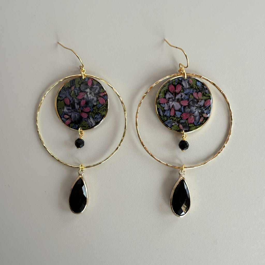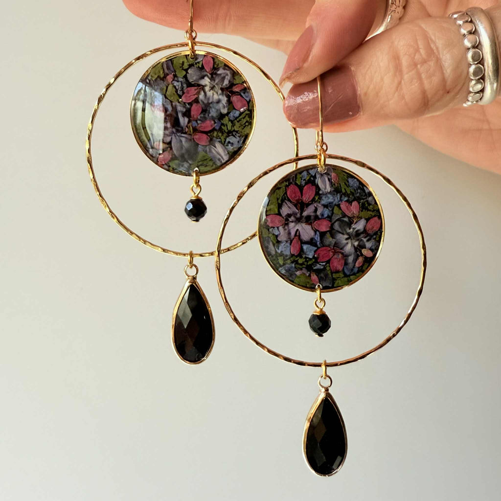 An abundance of real Heather, Lilac, Forget-Me-Not, and Maidenhair preserved in resin on hand painted black backgrounds in 24kt gold plated frames surrounded by 24kt gold plated hoops with faceted AAA Black Tourmaline in vermeil settings and Black Glass Teardrops in 24kt gold plated bezel.