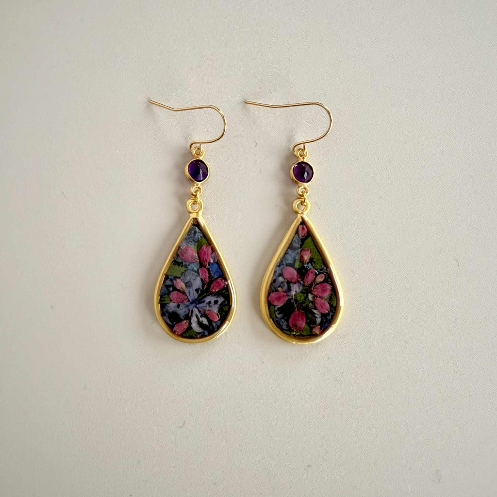An abundance of real Heather, Lilac, Forget-Me-Not, and Maidenhair preserved in resin on hand painted black backgrounds in vermeil frames with AAA faceted Amethyst in vermeil bezels.