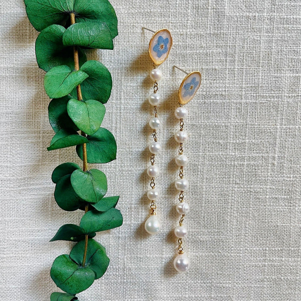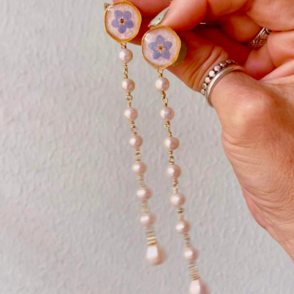 Real Forget-Me-Not preserved in resin on hand painted background in 18kt gold plated lily pad stud with strand of Freshwater Pearls with vermeil capped teardrop end Pearl.