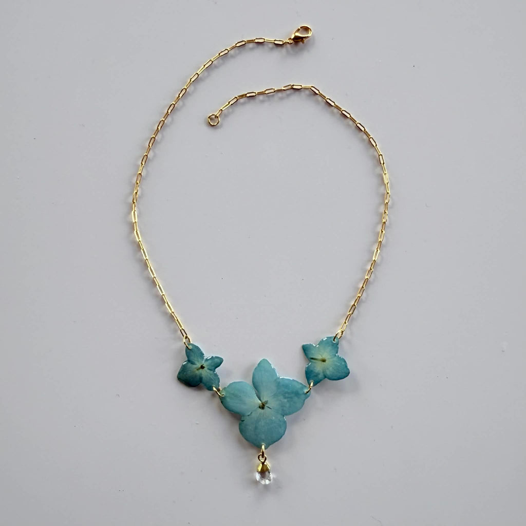 One of a kind, real hydrangea preserved in resin with AAA faceted Clear Crystal Quartz in 24kt gold plated setting.