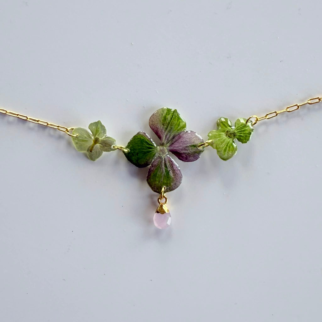 One of a kind, real hydrangea preserved in resin with AAA faceted Rose Quartz in 24kt gold plated setting.