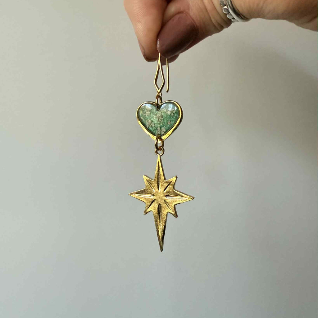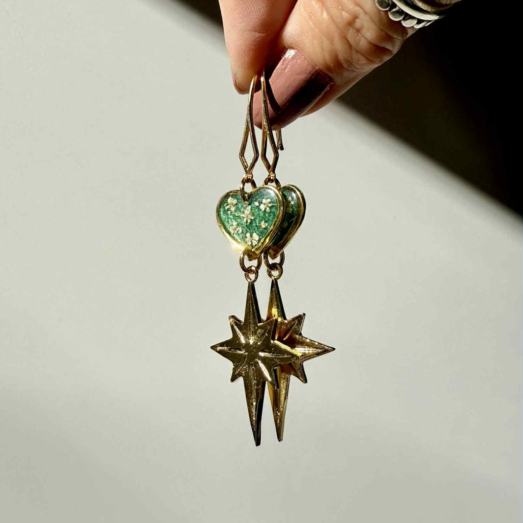 Preserved Queen Anne’s Lace with resin on hand painted green background, in 24kt gold plated frame and 24kt gold etched North Star accent.