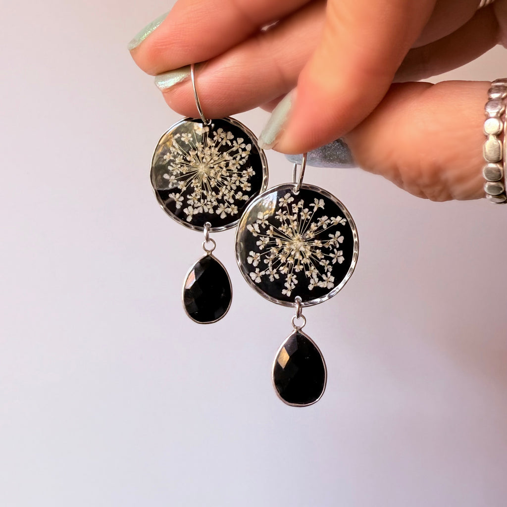 Real Hand-picked Queen Anne's Lace preserved in resin on hand painted background in sterling silver hammered frames with faceted black onyx teardrops in sterling silver bezels.