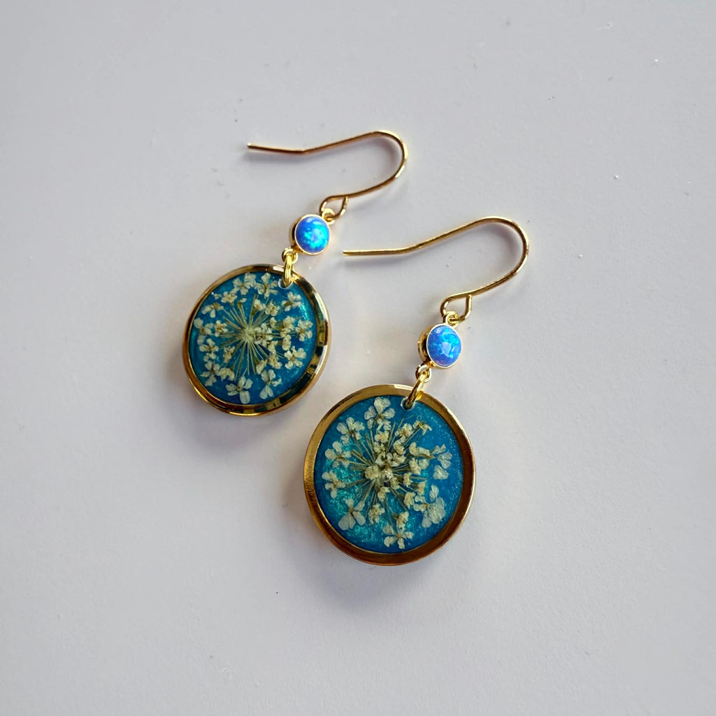 Real Queen Anne's Lace preserved in resin on hand painted backgrounds in gold fill frames with Blue Opals in vermeil settings.